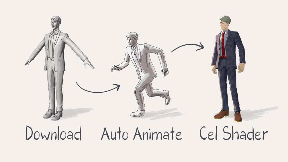 One Blender file for 4.2 version & one for 4.1 (and below) including a mannequin 3D model with Cel Shader already set up. There is also black outline created by using "Solidify" modifier.